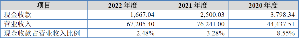 从上表可见,发行人现金收款占营业收入比例为2.48%-8.55%,金额区间为1,667.04-3,798.34万元,越在前期越高,越到后期因为内控要求而减少或改善。