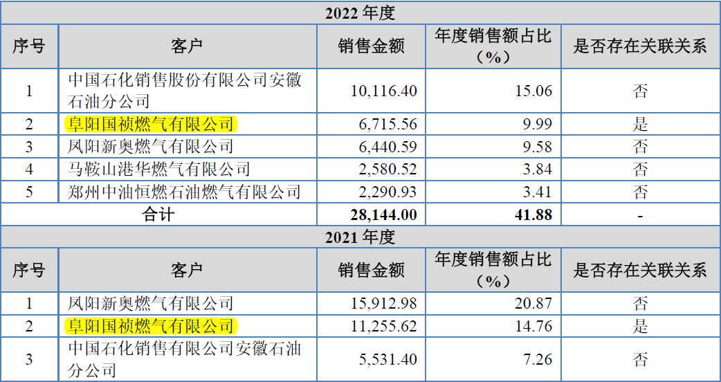 我们注意到上表中的年年稳居发行人第二大客户位置的阜阳国祯燃气有限公司,发行人2020年度-2022年度对其销售分别为8,545.46万元、11,255.62万元、6,715.56万元,占发行人当期营业总收入的比例约为10%-20%,招股书显示发行人和这个第二大客户关系可不一般,阜阳国祯是持有发行人重要子公司利辛国祯44.00%股权的少数股东,进而使得双方有了关联关系。