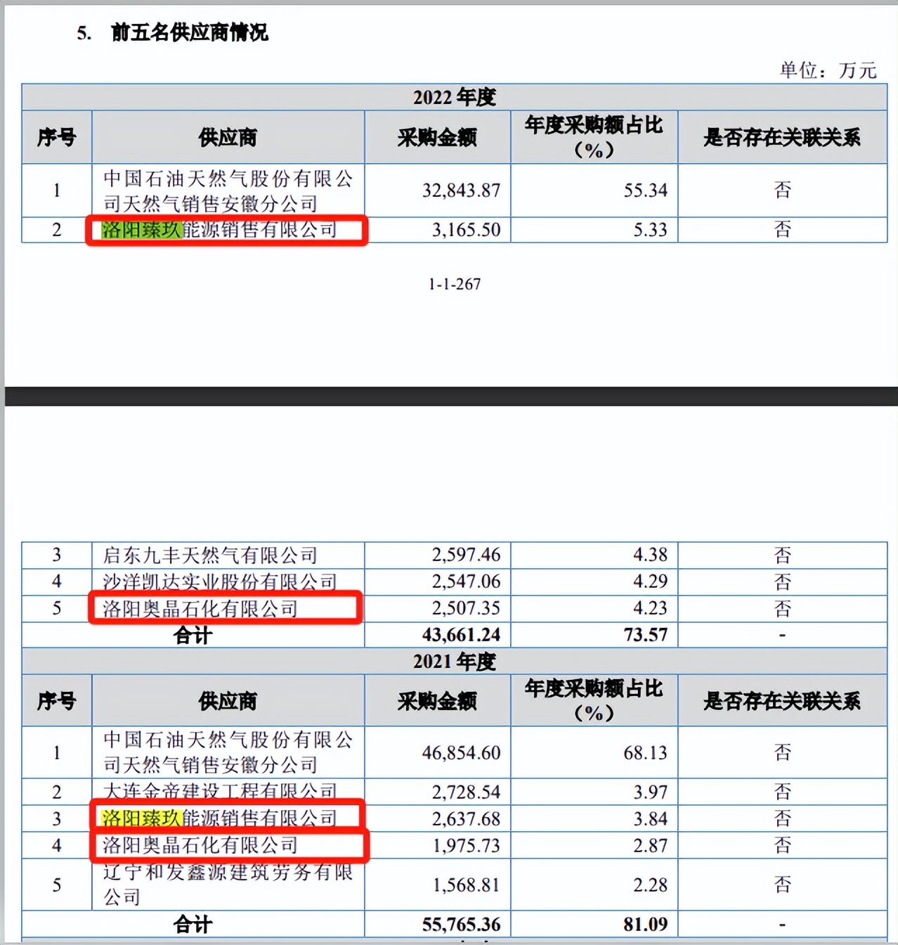 值得一提的是,发行人披露的前五大供应商列表中,并未将洛阳臻玖能源销售有限公司和洛阳奥晶石化有限公司作为同一家供应商或关联供应商合并统计采购金额(详见下表),也并未披露这两家供应商之间是否存在关联关系。