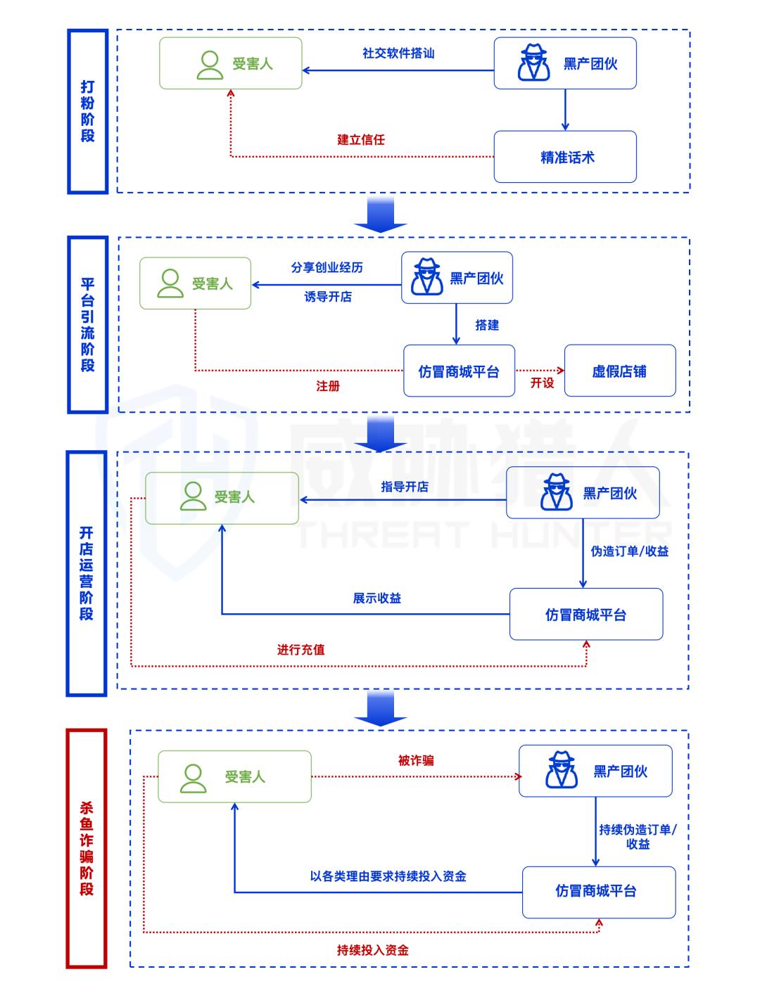 杀鱼诈骗阶段:当受害者投入大量资金后,诈骗者以延迟物流、冻结账户等为借口,进一步要求缴纳违约金或保证金,直到受害者资金被完全掏空。整个骗局伪装成合法创业,利用受害者对快速赚钱的渴望逐步完成诈骗闭环。