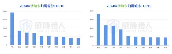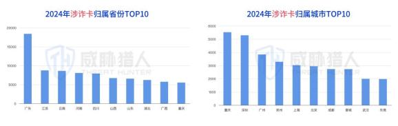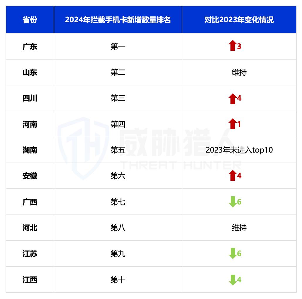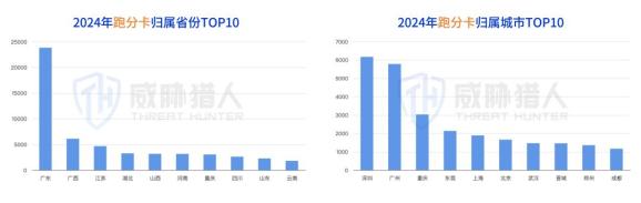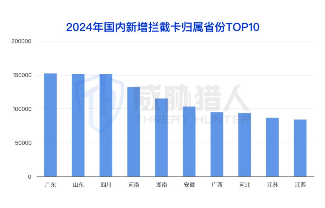 威胁猎人情报数据统计显示,2024年国内新增拦截卡归属地省份(含直辖市)主要集中在广东、山东和四川。