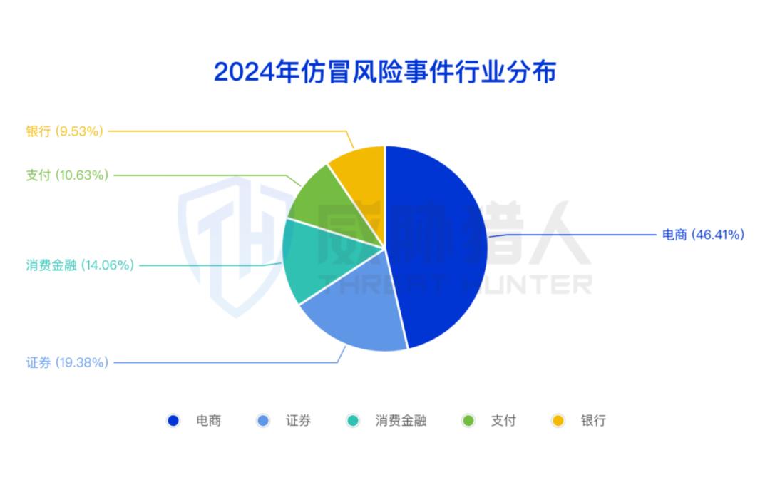 从2024年钓鱼仿冒事件的行业分布数据来看,钓鱼仿冒行业占比TOP3的行业为电商、证券行业和消费金融行业,其中电商行业成为钓鱼仿冒最为严重的行业,电商行业仿冒相关的风险案例占总量的46.41%。