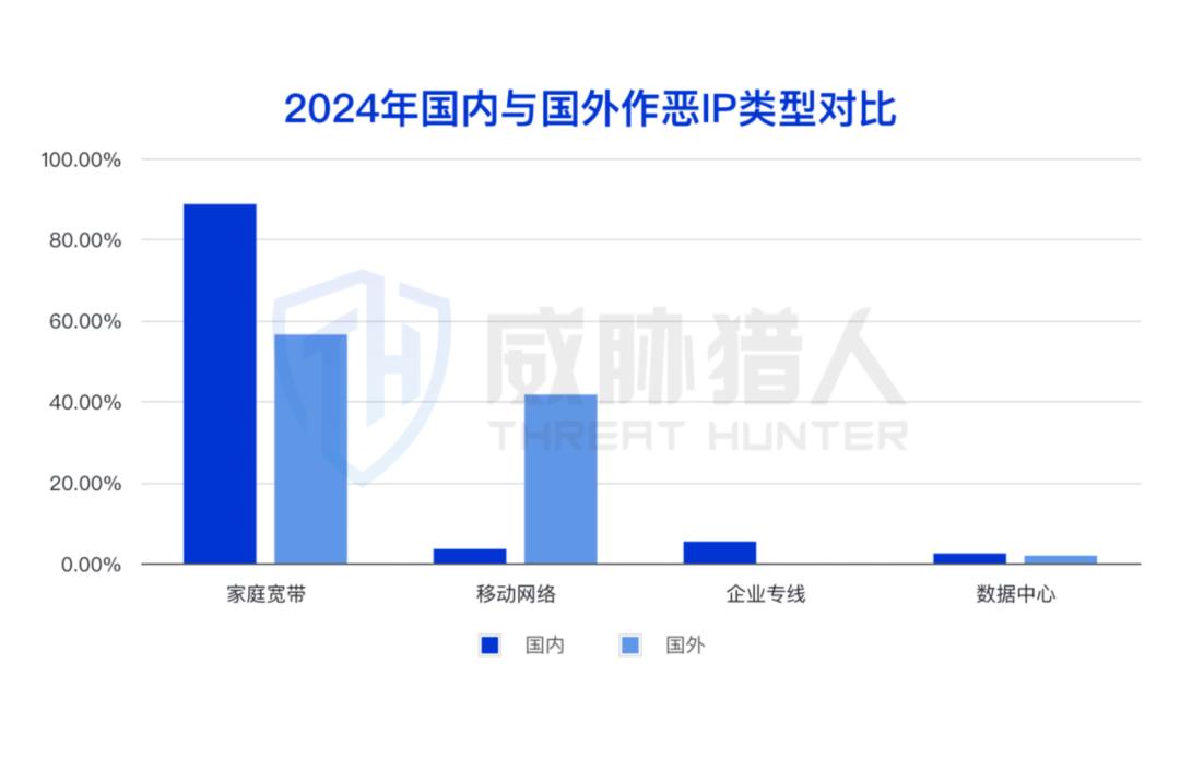 威胁猎人情报人员对国内和国外作恶IP类型进行分析,发现二者存在差异: