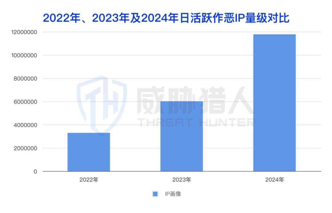据威胁猎人情报数据显示,近年来日活跃作恶IP数量持续上升,2024年日活跃作恶IP数量达到1178万,较2023年增长95.68%。