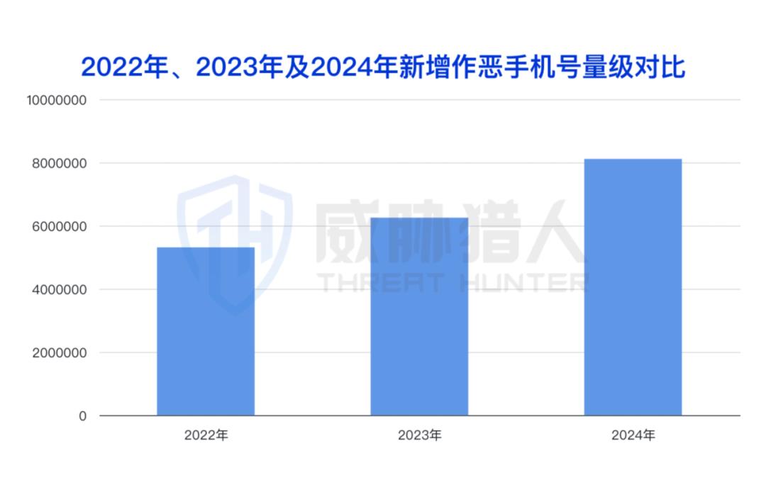 据威胁猎人情报数据显示,近年来国内作恶手机号数量持续上涨,2024年新增量级超800万,较2023年增长30%。