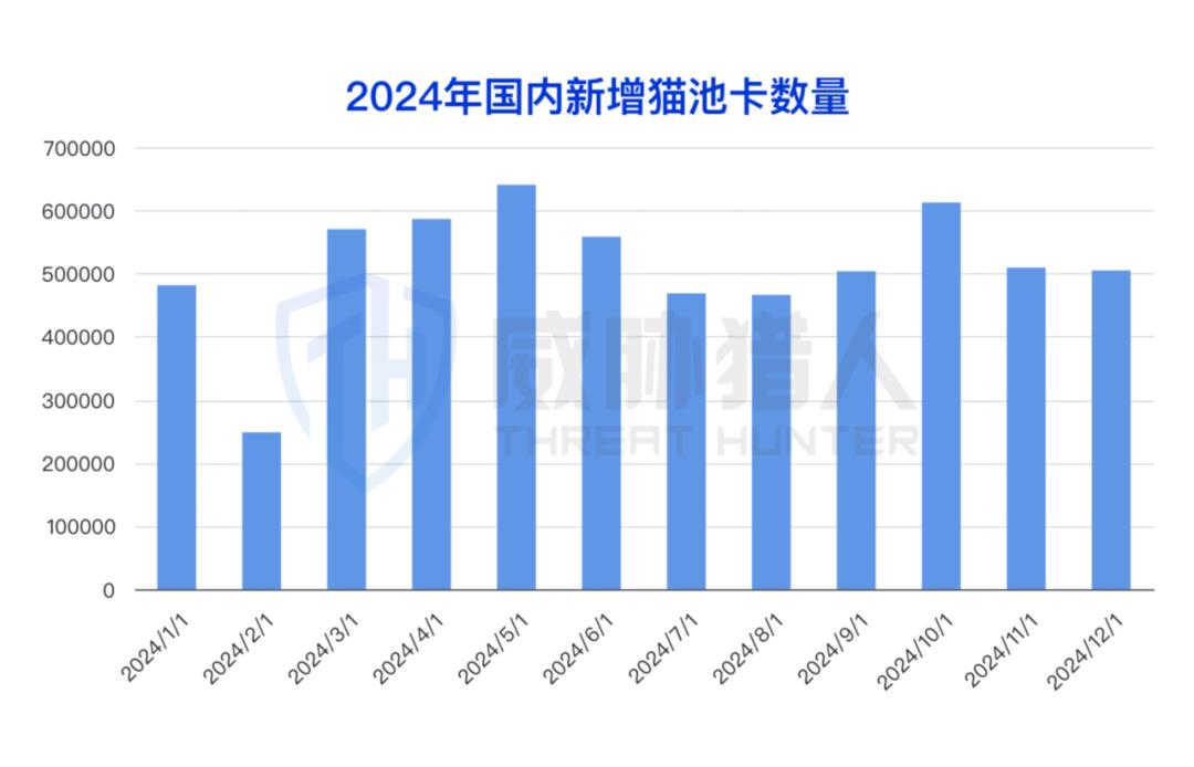 据威胁猎人情报数据显示,2024年国内新增猫池卡615万个,较2023年上升4.86%。