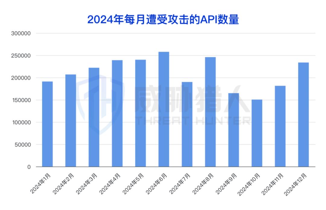 威胁猎人情报数据显示,2024年全年平均每月遭受攻击的API数量超过21万。
