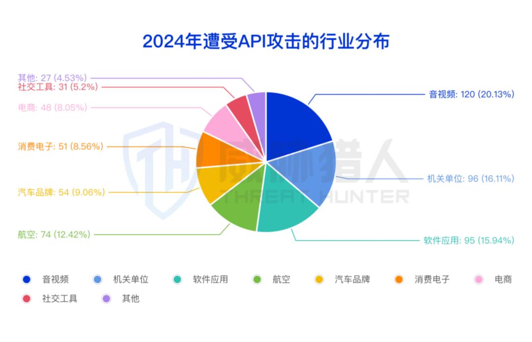 威胁猎人情报数据显示,2024年遭受攻击的API数量超过了250万,涉及音视频、软件应用、汽车、电商、政务等多个行业。