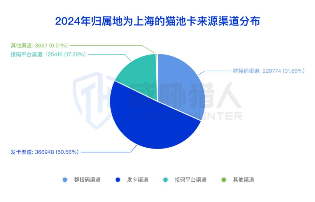 通过对上海今年新增的猫池卡来源渠道分析,发现来自发卡平台的猫池卡数量占比超过一半:
