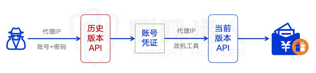 2024年9月,威胁猎人风险情报平台监测到攻击者对国内某互联网平台发起批量登陆攻击,使用历史版本的登录API接口获取用户凭证,再访问“当前版本应用”利用积分免费兑换商品业务,给企业带来损失。