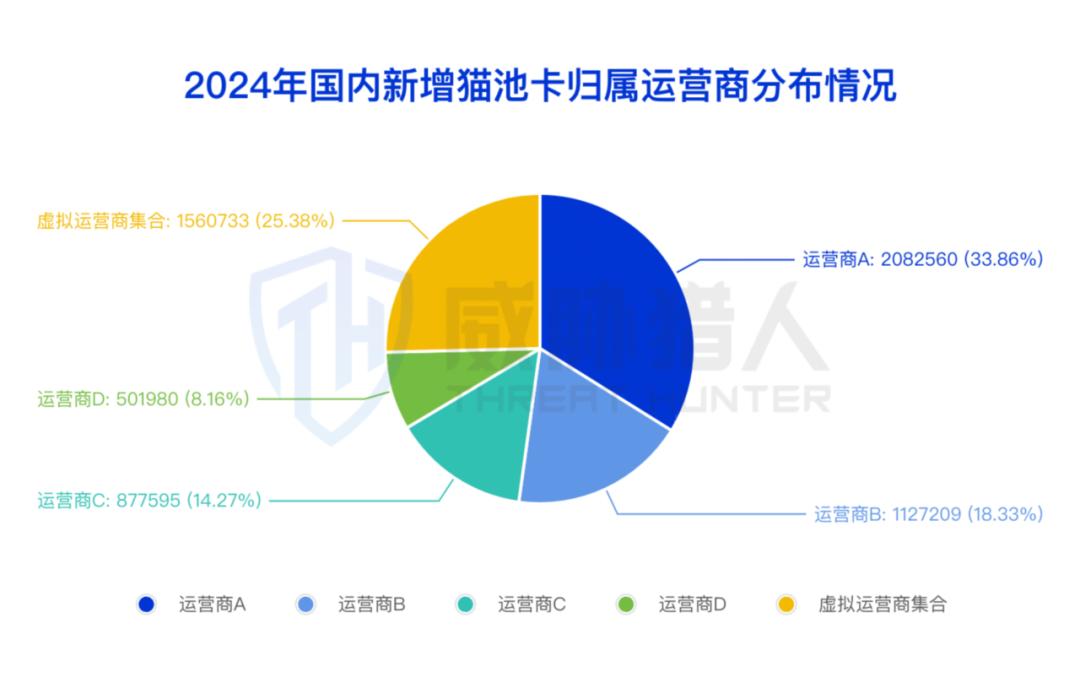 威胁猎人情报数据显示,今年国内新增猫池卡的归属运营商主要为基础运营商,占比高达76.42%,相比去年提升了14.51%。