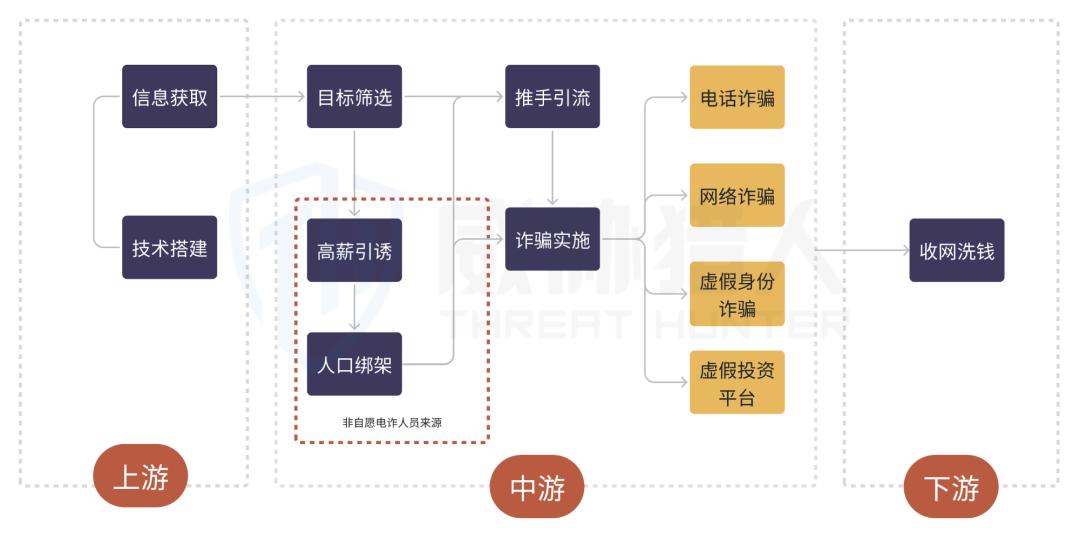 电信网络诈骗已形成了成熟的产业链条,电诈团伙内部有不同的角色和分工,成员之间紧密配合,共同开展诈骗活动: