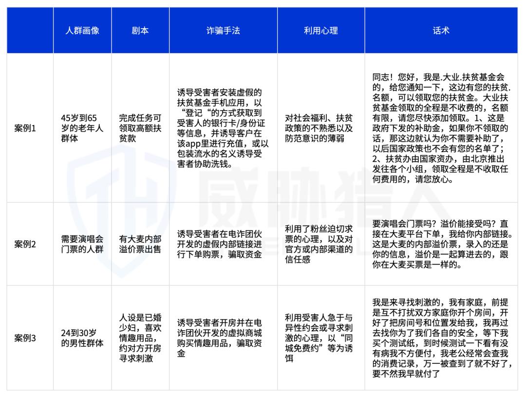 除了“王星事件”外,威胁猎人还监控到多种类型的剧本,分别利用不同人群的特定心理活动,精心制作匹配人物特性和心理的诈骗剧本,具体案例如下: