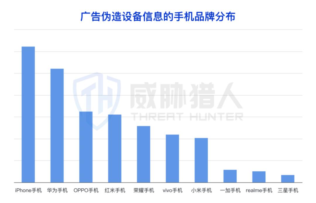 进一步分析发现,广告伪造的移动端中包含了手机及平板,其中以手机为主,覆盖多个手机品牌。