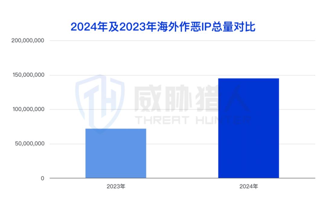 2024年,威胁猎人加强对海外作恶IP进行的监测,2024年共捕获海外作恶IP4479万个,相比2023年提升了102.14%。
