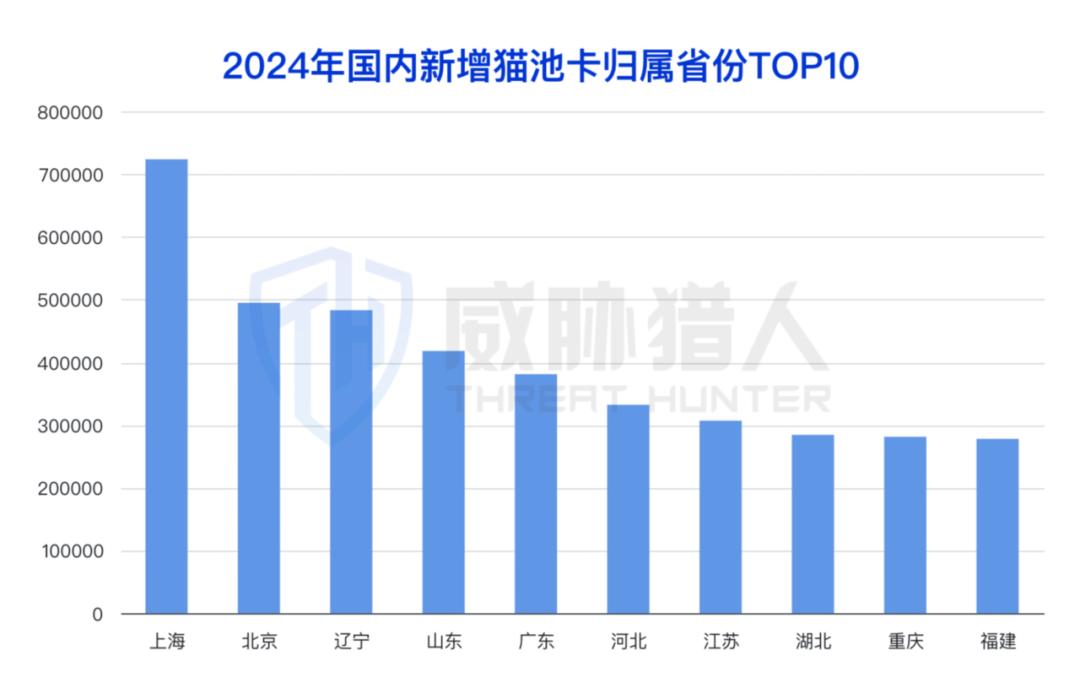 威胁猎人情报数据统计显示,2024年国内新增猫池卡归属地省份(含直辖市)主要集中在上海、北京和辽宁省。