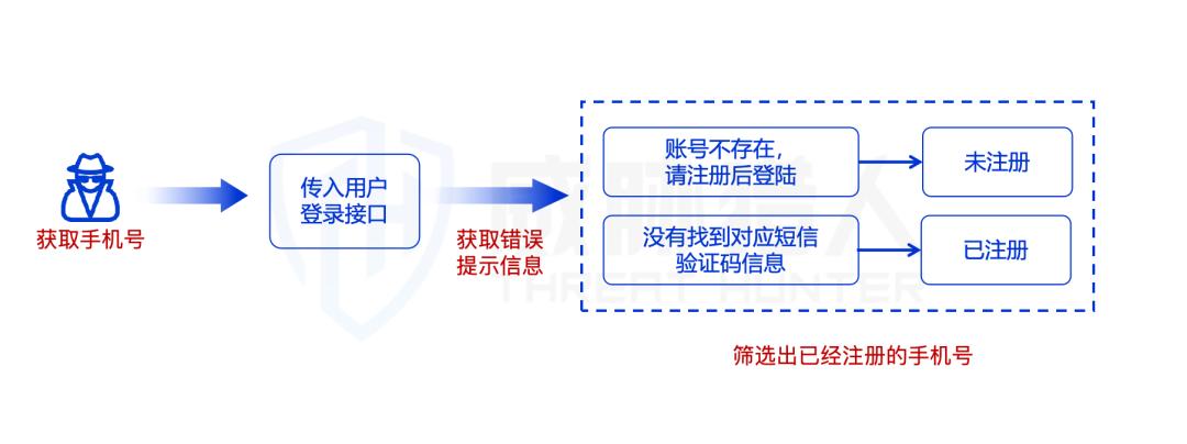 2024年6月,威胁猎人风险情报平台监测到攻击者对国内某银行发起扫号攻击。经过流量分析与复现,发现该银行资产接口存在“错误提示不合理漏洞”,黑产可大量验证手机号信息是否为平台注册用户,导致有效账号暴露,用户隐私泄露,威胁系统安全。