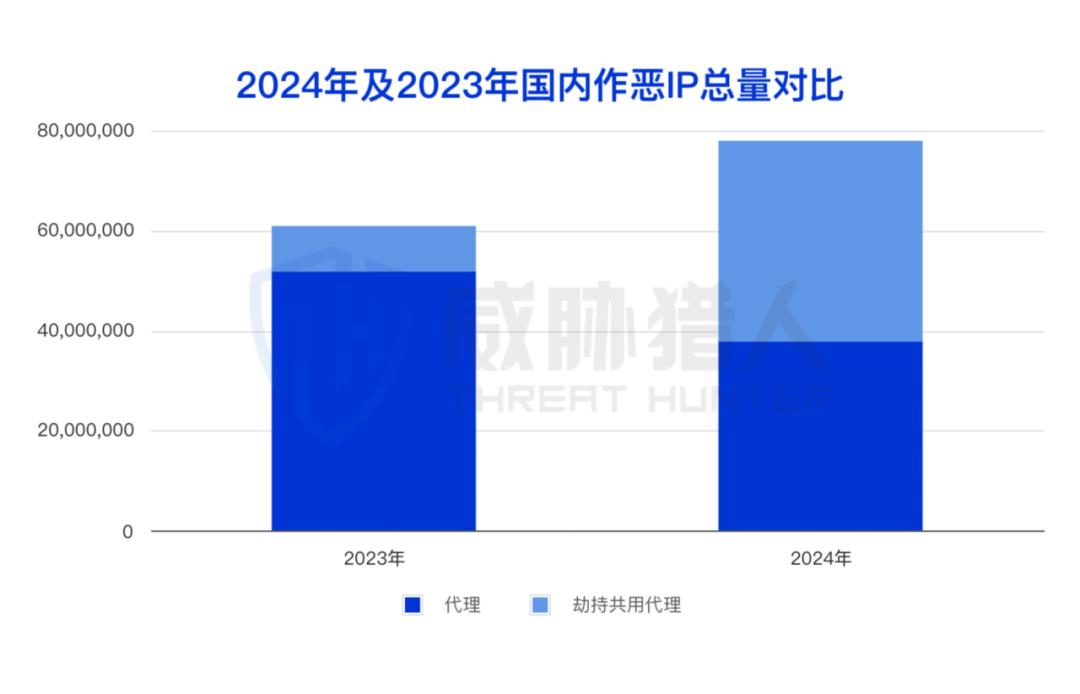 威胁猎人研究发现,2024年国内作恶IP的大幅增长主要是劫持共用代理IP数量急剧增长导致。2024年,国内劫持共用代理平台发展迅速,威胁猎人捕获劫持共用代理IP数量超4000万,占比从去年14.91%提升至今年的51.47%,且超过普通代理IP的占比。