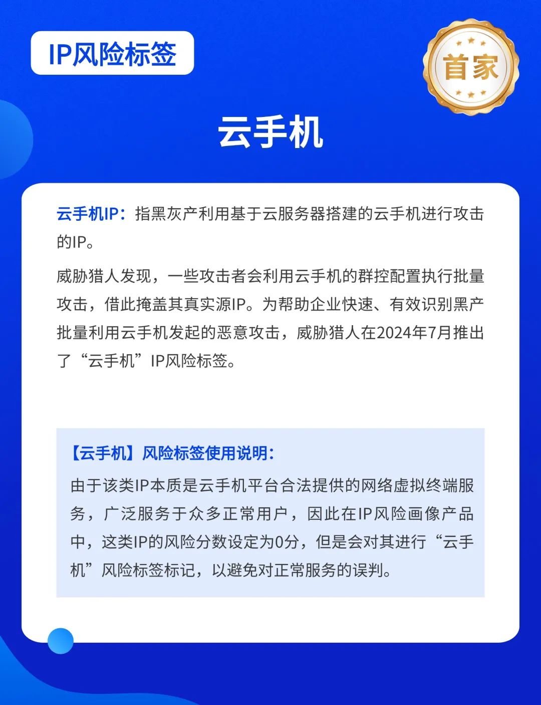 近年来,威胁猎人陆续发现正常用户与不法分子混合使用的作恶IP类型,并对其进行深入研究,于2024年推出「劫持共用代理IP」、「云服务IP」、「云手机IP」等风险标签。