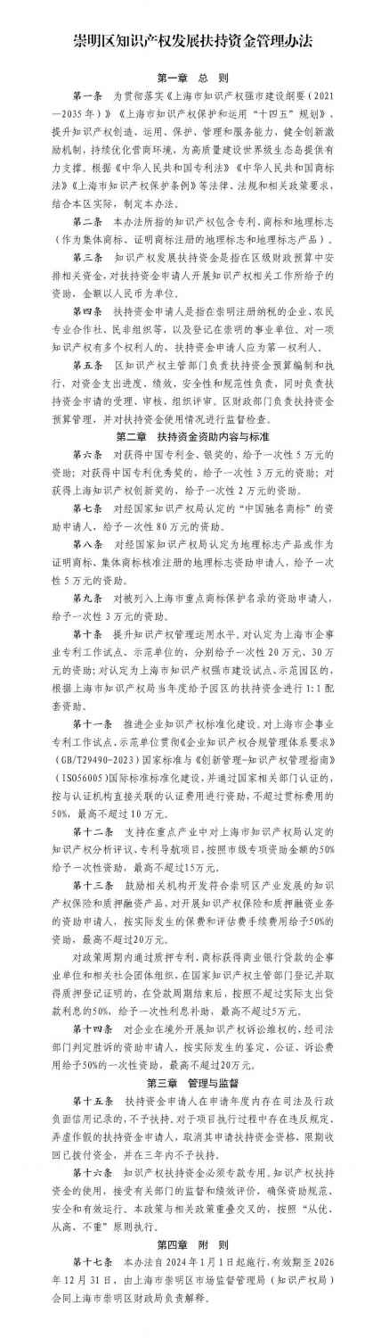 崇明:《崇明区知识产权发展扶持资金管理办法》发布
