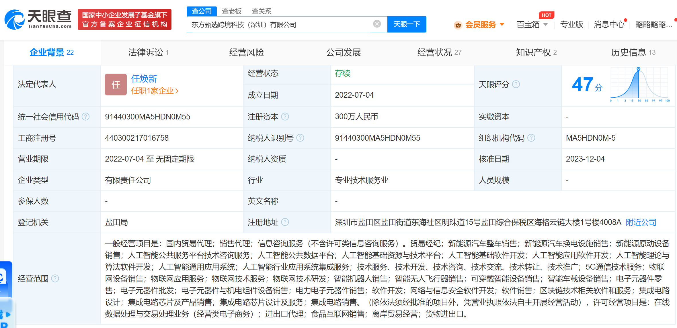 天眼查显示,东方甄选跨境科技(深圳)有限公司成立于2022年7月,法定代表人为任焕新,注册资本300万人民币,由任焕新、马斯克教育发展(深圳)有限公司共同持股。公开信息显示,新东方于2021年12月上线直播带货平台“东方甄选”。