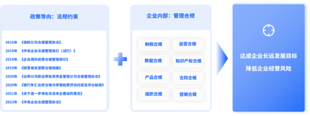 近年,各行各业相继发布政策约束企业管理,对企业内部而言如财税合规、数据合规、合同合规等都是企业管理的重要组成部分。企业管理合规化也提出新的目标,从合规遵从到价值创造,从而达成企业长远发展目标,降低企业经营风险。