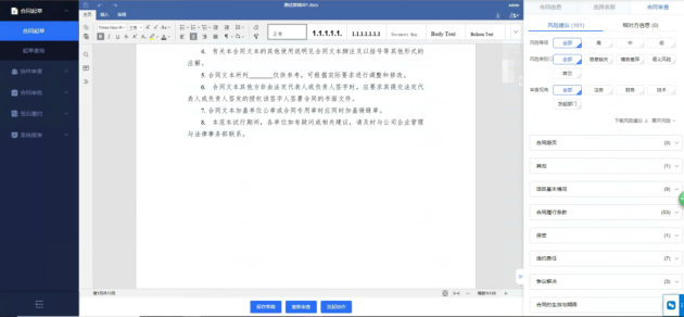 痛点现状:自动审查合同文本,智能提示风险点,高亮显示和关联定位,并依据对应的风险内容提供推荐条款,并且提供在线编辑功能。