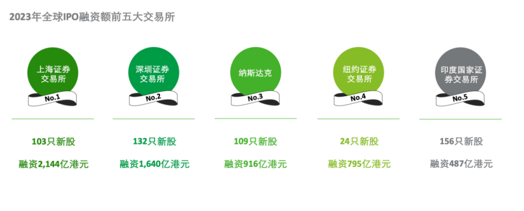 2023年,除了一季度外,后三个季度港股新股上市乏力。全年整体新股融资总额和融资数量均为过去二十年以来的低位,跌出全球IPO融资前五位置,排名第六位。德勤数据显示,上交所、深交所、纳斯达克及纽交所维持环球新股融资额排行榜前四位置,印度国家证券交易所上升至第五位。