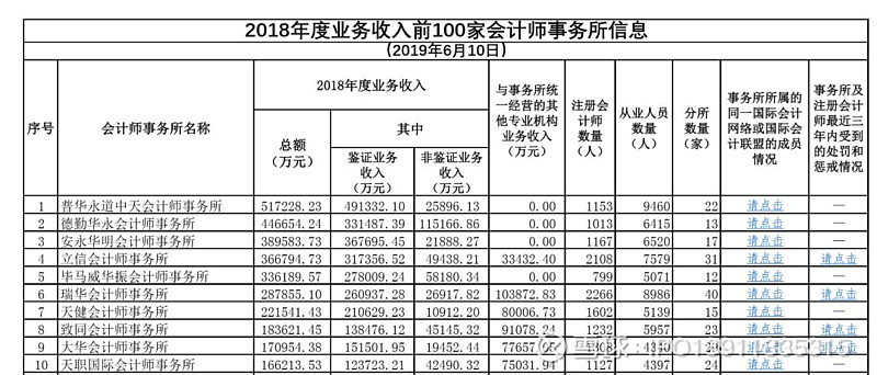 中注协发布《2018年度业务收入前100家会计师事务所信息》