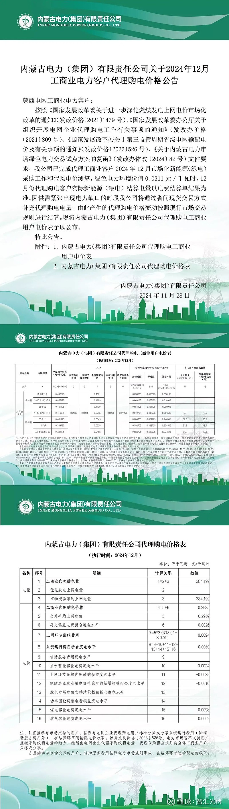 以下为2024年11月各地电网企业代理购电价格表,顺序依次为:江苏、浙江、安徽、山东、山西、北京、河北南网、冀北、河南、上海、重庆、黑龙江、吉林、辽宁、蒙东、蒙西、江西、湖北、湖南、青海、宁夏、陕西、天津、甘肃、新疆、广东、广西、海南、贵州、云南、深圳、福建。