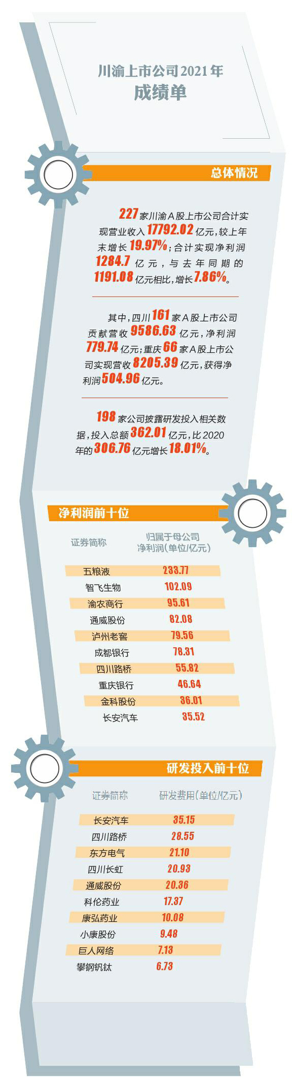 在上市步伐加快的同时,川渝两地上市公司也交出了2021年的“成绩单”:合计实现营业收入17792.02亿元,较上年末增长19.97%;合计实现净利润1284.7亿元,与去年同期的1191.08亿元相比,增长7.86%。其中,四川161家A股上市公司贡献营收9586.63亿元,净利润779.74亿元;重庆66家A股上市公司实现营收8205.39亿元,取得净利润504.96亿元。