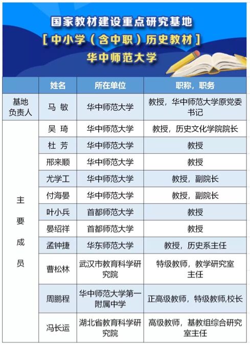 2月25日,教育部公布首批国家教材建设重点研究基地,我校入选中小学(含中职)历史教材研究基地,基地负责人为我校中国近代史研究所所长马敏教授。9月16日,中小学(含中职)历史教材研究基地获教育部正式授牌。