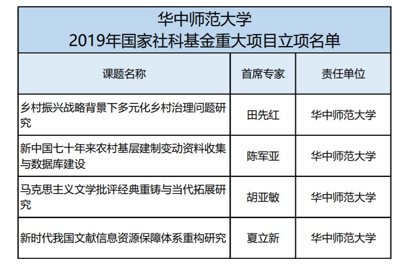 4项课题获得国家社科基金重大项目立项;31项课题获得国家社科基金年度项目和青年项目立项;32项课题获得教育部人文社科年度项目立项;国家社科基金教育科学规划项目9项、国家社科基金艺术学项目1项、国家社科基金后期资助项目8项;国家社科中华学术外译项目2项;31项课题获湖北省社科基金年度项目立项。