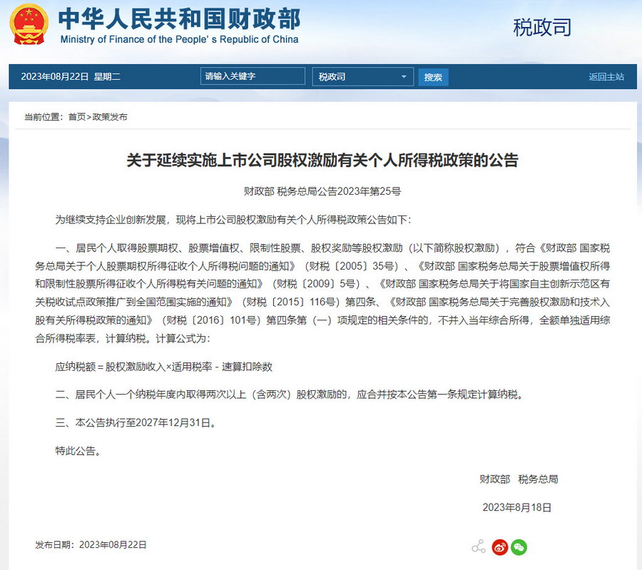关于延续实施上市公司股权激励有关个人所得税政策的公告