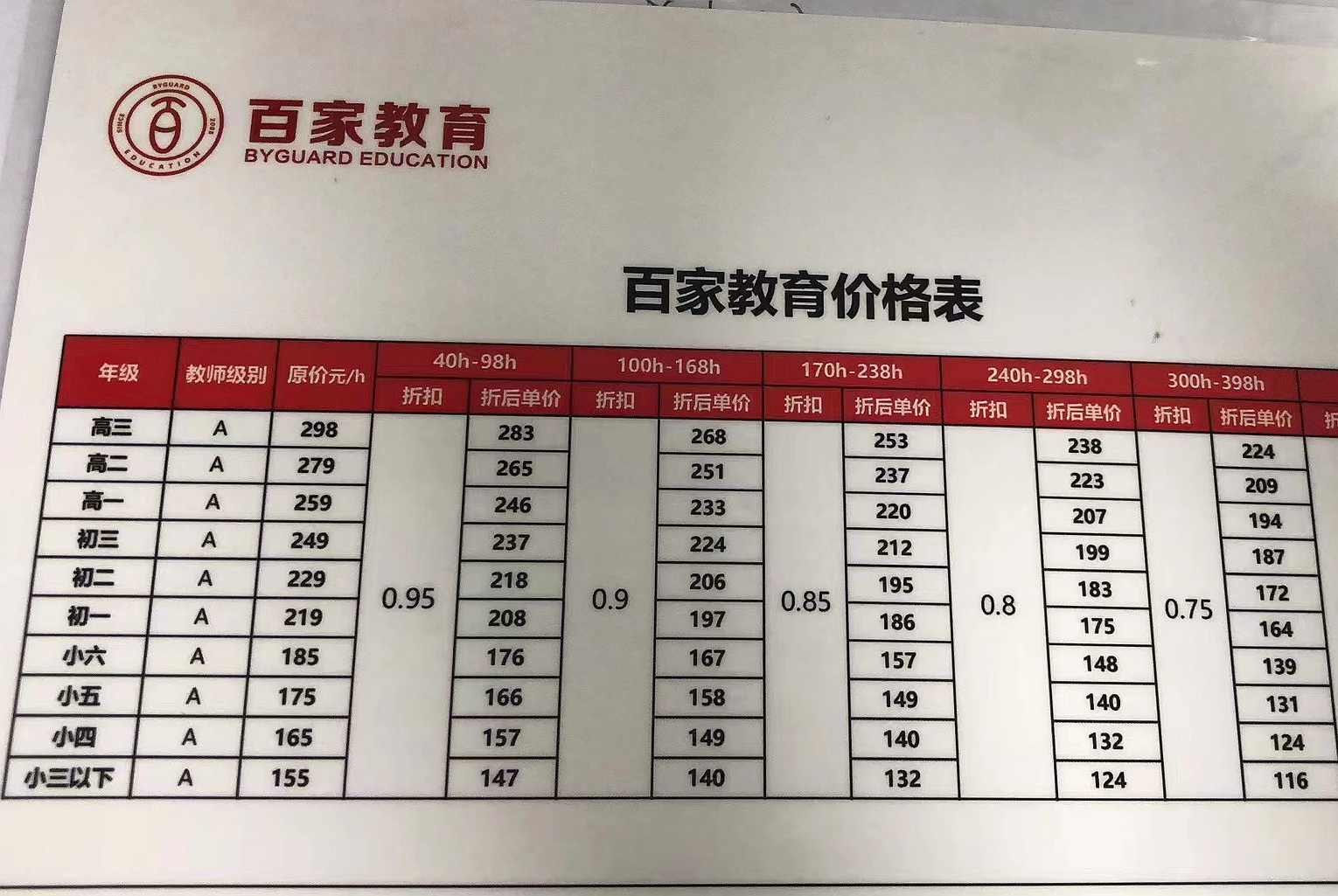达慧学校宣传的政策是买的课时越多,优惠力度越大。家长出具的百家教育价格表显示,涉及小学三年级至高中三年级课程,原价一小时为155元至298元,如果购买40至98小时折扣0.95,100至168小时折扣0.9,400小时以上最大折扣0.65。