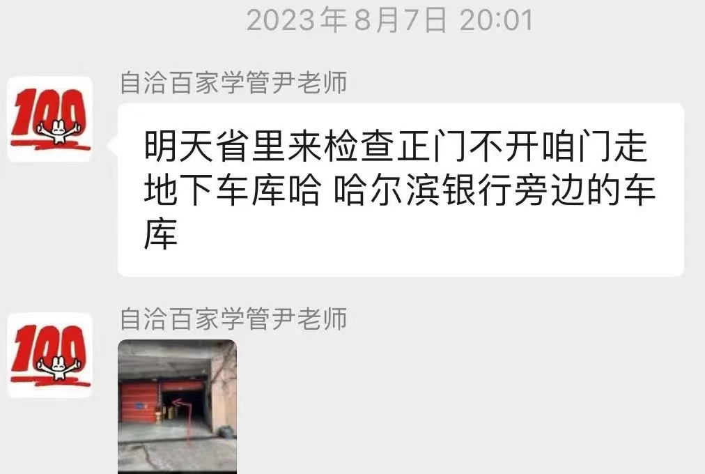 学管老师通知家长带学生从车库进入,以躲开检查。受访家长供图