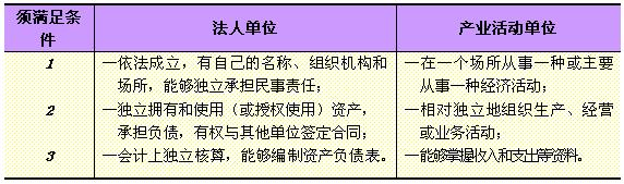 在统计调查和管理中,常用的单位类型有法人单位和产业活动单位。法人单位和产业活动单位的构成条件(见下表):