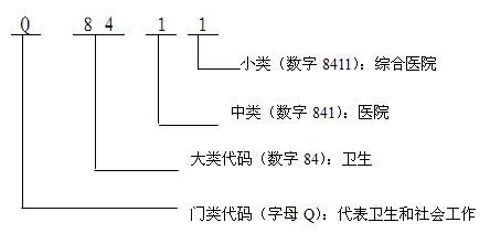 国民经济行业分类标准按照同质性原则,将全社会经济活动分为门类、大类、中类和小类四个层次。其中,门类采用英文字母编码,大、中、小类采用阿拉伯数字编码。各层次具体代码结构,以综合医院(Q8411)为例,见下图: