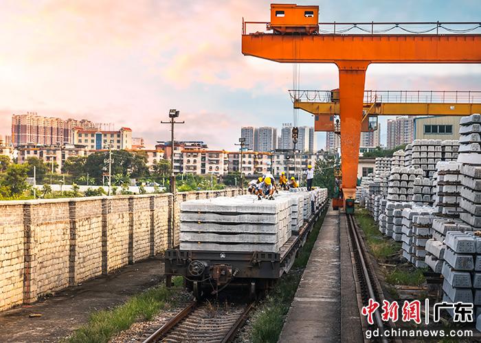 图为安捷公司工作人员进行轨枕装运