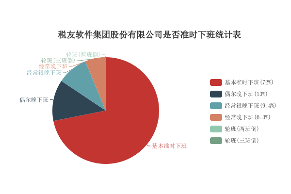 在税友软件集团股份有限公司工作的人71%的反馈基本准时下班,12%的反馈偶尔晚下班,6%的反馈经常晚下班,9%的反馈经常很晚下班,具体见以下统计图。