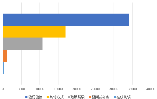 通过不同渠道和方式公开政府信息的情况,其中,通过政府公报公开政府信息4899条,占总数的0.38%;政府网站公开政府信息921908条,占总数的71.19%;政务微博公开政府信息226278,占总数的17.48%;政务微信公开政府信息66479条,占总数的5.13%;其他方式公开政府信息75367条,占总数的5.82%。