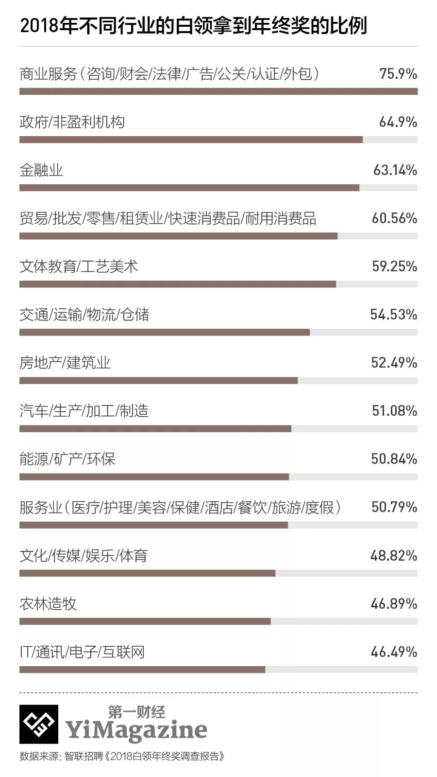 而在智联的调研中,另一个涨幅明显的领域是政府及公共服务机构,其奖金涨幅也达到19%以上。另外,包括咨询、财会、广告、公关等领域在内的商业服务行业,公司人能够拿到的年终奖比例最多,为75.9%,并且该行业的公司人对年终奖的满意度也最高,为3.85。
