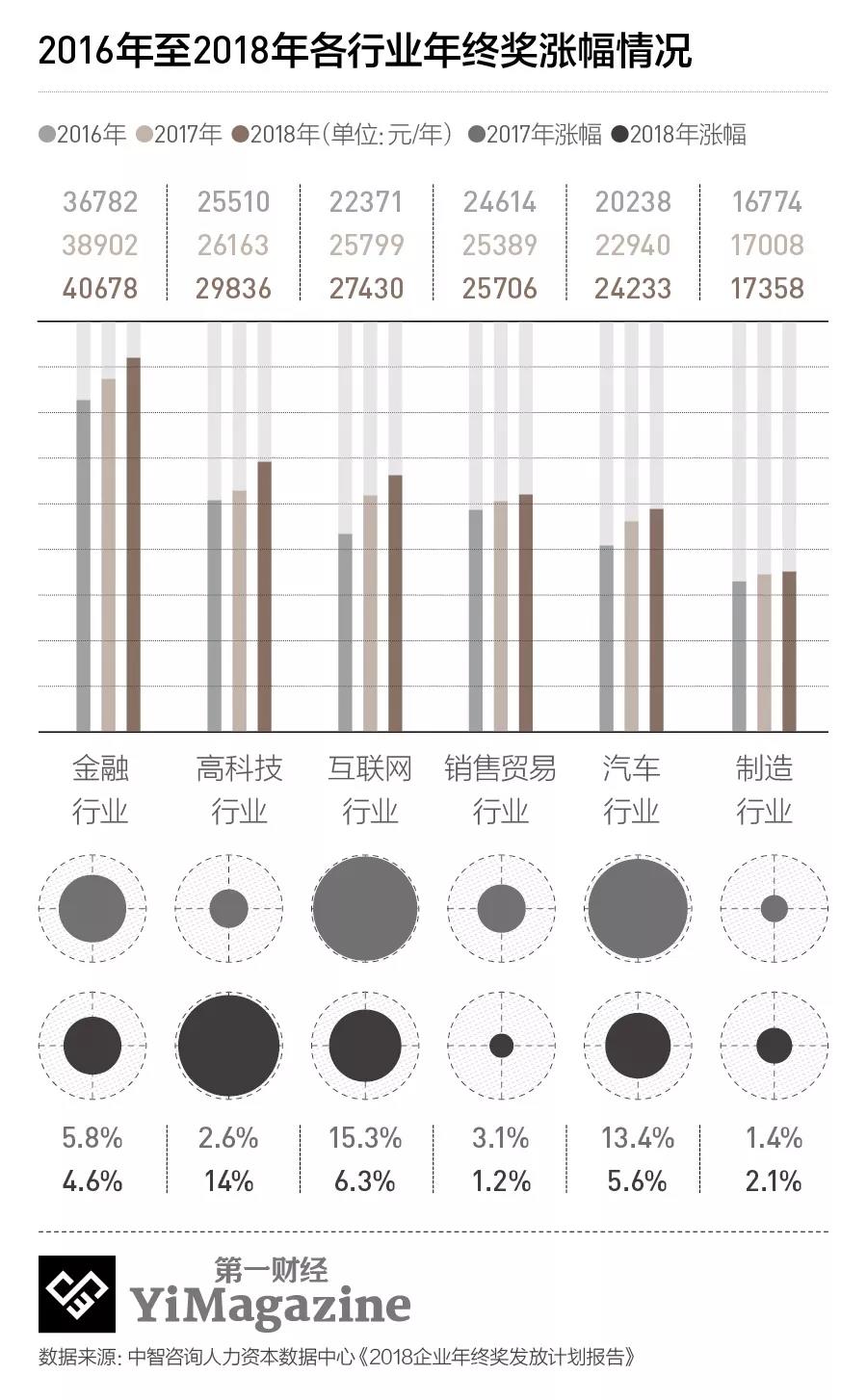 值得注意的是,往年在年终奖发放表现优秀的互联网、汽车、金融和房地产四大热门行业,2018年年终奖涨幅将有所下降。尤其是互联网行业,从2017年涨幅为15.3%下降到2018年的6.3%,汽车行业则从2017年的13.4%下降到5.6%。
