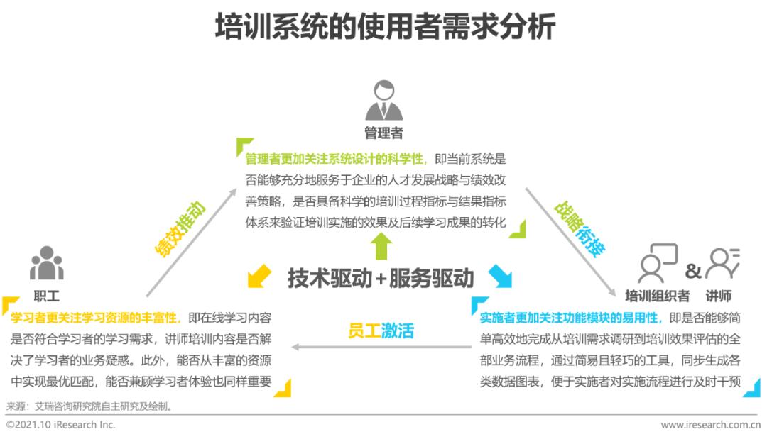 从产品定位的角度,培训系统可分为两种:一种是通用型系统,主要面向绝大多数企业在培训管理及实施过程中的通用需求;另一种是垂直型系统,多针对某些特定行业,在通用需求之上,能够基于自身深刻的行业与业务理解能力来充分覆盖企业的特殊需求。从使用者的视角来看,培训系统旨在为企业管理者评估培训效果提供数据量表,为企业培训人员组织培训活动提供管理工具,为企业职工参与培训提供学习平台,因此,系统设计的科学性、功能模块的易用性和学习资源的丰富性是培训系统的合格线。在此基础之上,头部厂商还会通过技术及服务来提升用户体验,增强用户对平台的粘性,推动人力资源开发的进程。