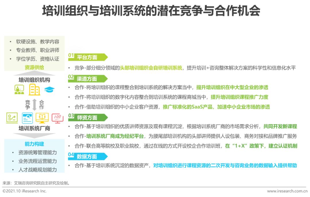 随着行业的不断发展,专业化程度将进一步提升,各主要参与者的核心竞争优势也将更加明显,在高度专业化分工的体系之下,行业有望通过构建开放的产业合作关系网络,充分发挥各自的比较优势,实现互利互惠的多赢局面。于培训组织而言,其核心价值应定位于丰富且优质的资源供给,可通过“在线化”与“平台化”来实现共创与共享,以来提升资源供给的质量与效率。于培训系统而言,其核心价值应定位于高效且灵活的能力构建,天然具备平台化运作的优势,既可成为资源供给方的拓客渠道,也可将平台内沉淀的大量数据资产,作为资源开发的重要依据,赋能客户企业及厂商的生态合作方。