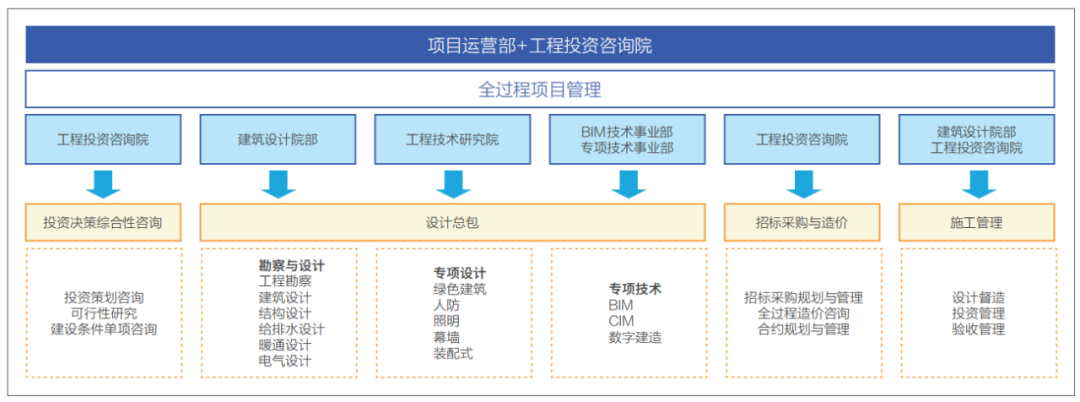 组建全过程工程咨询运营机构或专业机构,配置必要的复合型人才团队,补齐专业漏项或短板,进行全过程工程咨询的运营与管理工作。为便于统筹调配资源力量,企业内部业务流程与协作机制均需根据全过程工程咨询的内涵进行优化。