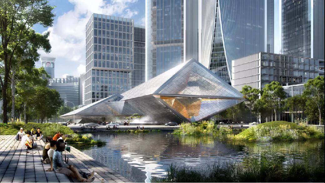 “金石叠山”既是镌刻深圳金融中心成长历程的“时代金石”,也用“叠山”意向传达“长久稳固”的金融业愿景。简洁且动感的线条沿深南大道勾勒出一艘全球科创中心蓄势待发的“未来旗舰”,朝向香蜜湖山海通廊是展示中国金融生态系统的“国际视窗”。