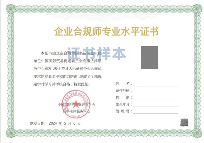 (五)学员服务1.获得企业合规师证书的学员将进入企业合规师专业人员库,可优先参加中国商业联合会和中国贸促会组织的论坛、讲座、培训、考察等企业合规专业交流活动。