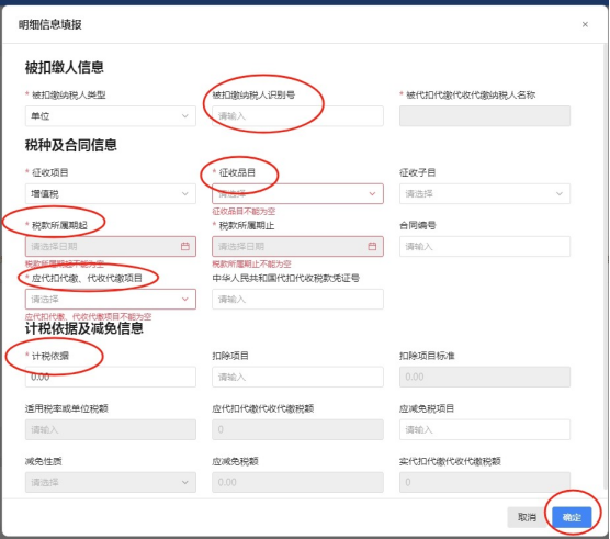 (三)输入【被扣缴纳税人识别号】【征收品目】【税款所属期起】【应代扣代缴、代收代缴项目】【计税依据】【确定】。