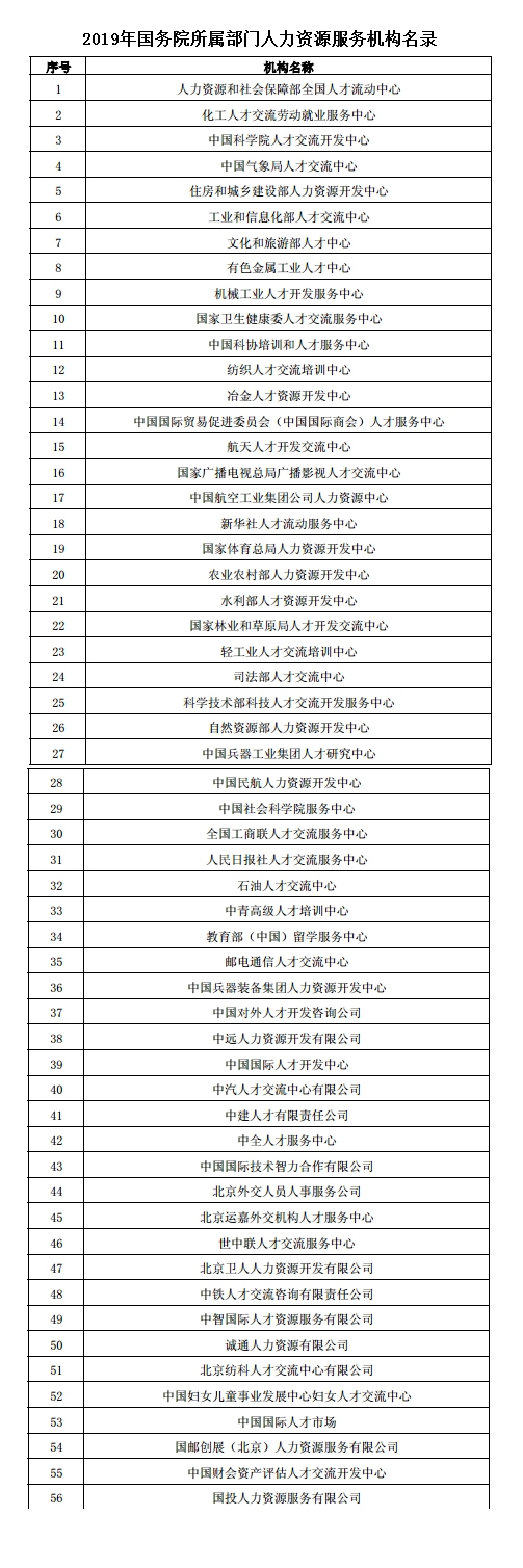 根据国务院推进“放管服”改革精神和《人力资源市场暂行条例》有关规定,2020年1月,人社部办公厅印发了《关于开展2019年国务院所属部门人力资源服务机构年度报告公示工作的通知》,在国务院所属部门人力资源服务机构中开展了年度报告公示工作。人力资源和社会保障部全国人才流动中心等56家人力资源机构已按要求完成年度报告公示工作。现将名录予以发布。